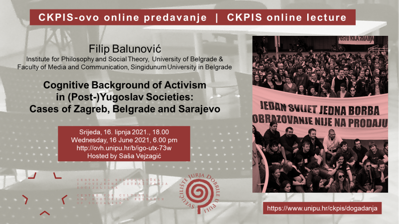 Poslije Zimskog i Ljetnog semestra CKPIS-a, dvaju ciklusa s četrnaest javnih predavanja, prije ljetnih praznika nudimo još jedno gostovanje. Politolog Filip Balunović, istraživač na Institutu za filozofiju i društvenu teoriju Sveučilišta u Beogradu i predavač na Sveučilištu Singidunum, dat će povijesnu analizu interakcije između kritičkih ideja i političkih i društvenih pokreta te govoriti o vezi između kritičkog znanja i borbi aktivističkih grupa u Zagrebu, Beogradu i Sarajevu u današnjem kontekstu. U ime CKPIS-a domaćin i moderator rasprave bit će poslijedoktorand Saša Vejzagić.