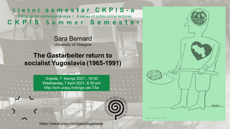 U Ljetnom semestru CKPIS-a gostuje Sara Bernard sa Sveučilišta u Glasgowu, čije će se predavanje o povratku gastarbajtera u Jugoslaviju temeljiti na njezinoj studiji Deutsch Marks in the Head, Shovel in the Hands and Yugoslavia in the Heart: the Gastarbeiter Return to Yugoslavia 1965-1991 (2019), prvoj koja temeljitije obrađuje ovu temu ocrtavajući složenost odnosa između „radnika na privremenom radu u inozemstvu“, države i društvenog okruženja.