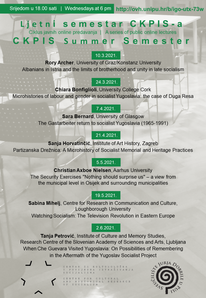 Od ožujka do lipnja 2021. u ciklusu online predavanja Ljetni semestar CKPIS-a održano je sedam predavanja. Naši gosti bili su Rory Archer (Albanians in Istria and the limits of brotherhood and unity in late socialism), Chiara Bonfiglioli (Microhistories of labour and gender in socialist Yugoslavia: the case of Duga Resa), Sara Bernard (The Gastarbeiter return to socialist Yugoslavia), Sanja Horvatinčić (Partizanska Drežnica: A Microhistory of Socialist Memorial and Heritage Practices), Christian Axboe Nielsen (The Security Exercises "Nothing should surprise us" – a view from the municipal level in Osijek and surrounding municipalities), Sabina Mihelj (Watching Socialism: The Television Revolution in Eastern Europe) i Tanja Petrović (When Che Guevara Visited Yugoslavia: On Possibilities of Remembering in the Aftermath of the Yugoslav Socialist Project). Zajedno s programom u zimskom semestru ukupno je održano četrnaest predavanja. Hvala svim predavačima i publici!