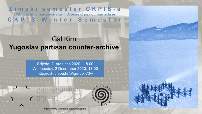 U Zimskom semestru CKPIS-a na redu je četvrto predavanje koje će pod naslovom „Yugoslav partisan counter-archive“ održati Gal Kirn, gostujući profesor kulturne povijesti na Sveučilištu u Novoj Gorici, s prethodnim radnim iskustvom u Berlinu, Leipzigu i Dresdenu. Predavanje se temelji na njegovoj posljednjoj knjizi „Partisan Counter Archive: Retracing the Ruptures of Art and Memory in the Yugoslav People's Liberation Struggle and Beyond“ (2020). Gal Kirn govorit će o postsocijalističkom revizionističkom demoniziranju revolucionarne jezgre Narodnooslobodilačke borbe, o politici nacionalne pomirbe na primjeru Slovenije i jednog ljubljanskog spomenika te o emancipatorskim fragmentima partizanske prošlosti nastalima u intenzivnom susretu političkog i umjetničkog eksperimentiranja. Predavanje će biti održano na engleskom jeziku u virtualnoj dvorani.