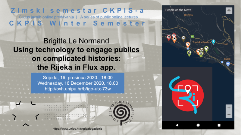 Brigitte Le Normand, izvanredna profesorica povijesti na Sveučilištu British Columbia Okanagan, autorica studija o urbanizaciji i migracijama radnika u socijalističkoj Jugoslaviji te voditeljica projekta „Rijeka in Flux: granice i urbane promjene poslije Drugog svjetskog rata“, peta je gošća Zimskog semestra CKPIS-a. Održat će predavanje „Using technology to engage publics on complicated histories: the Rijeka in Flux app.“ kojim će predstaviti rad na interdisciplinarnom projektu te aplikaciju koja pomaže u razumijevanju povijesti Rijeke i omogućuje interakciju s prošlošću grada. Predavanje će biti održano na engleskom jeziku u virtualnoj dvorani.