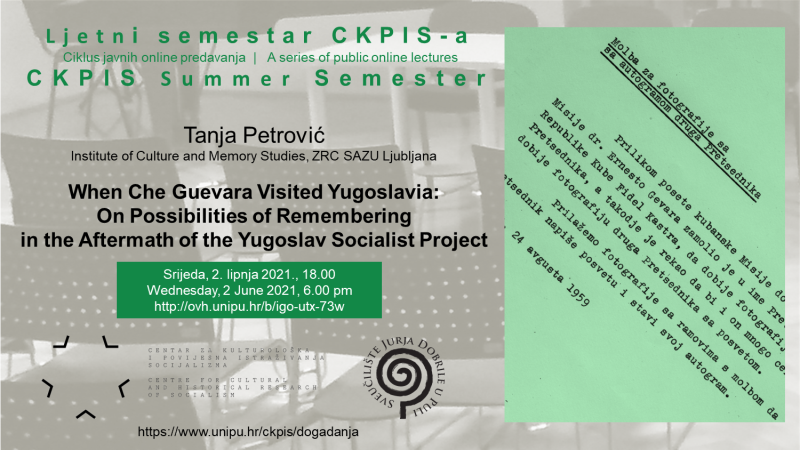 Sedmo i posljednje predavanje u Ljetnom semestru CKPIS-a održat će Tanja Petrović, znanstvena savjetnica na Institutu za kulturalne studije i kulturu sjećanja pri Znanstveno-istraživačkom centru Slovenske akademije znanosti i umjetnosti u Ljubljani, s kojim CKPIS ima uspješnu višegodišnju suradnju. Predavanje polazi od posjeta Che Guevare i kubanskog izaslanstva Jugoslaviji 1959., događaja koji se smješta u kontekst javnih narativa o prošlosti i kulture sjećanja, mimo kasnije mitologizacije lika kubanskog revolucionara i kraja socijalističke Jugoslavije, ali uzimajući u obzir prošle vizije budućnosti.